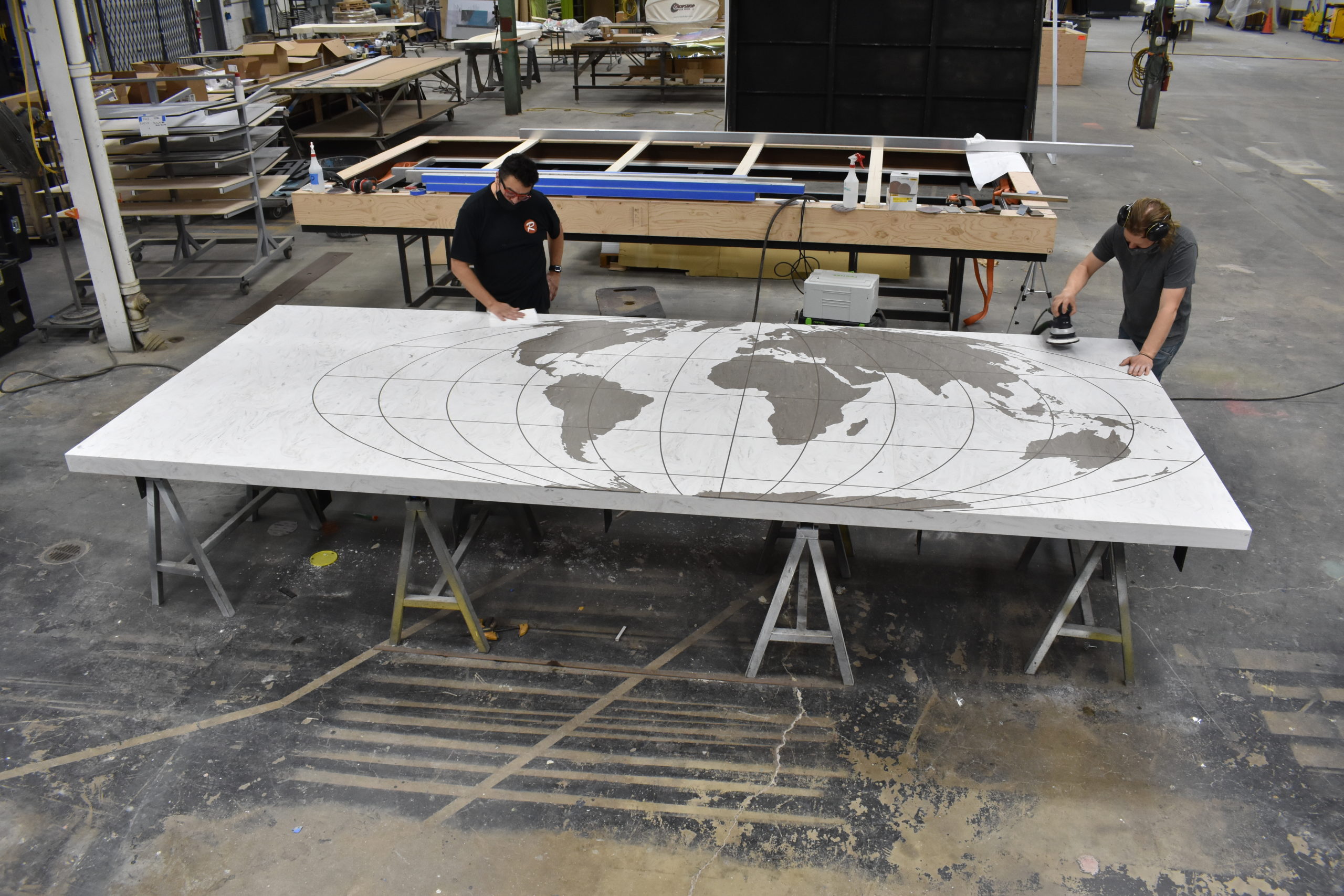 Carpenters work on a large map in the Ravenswood Studio shop